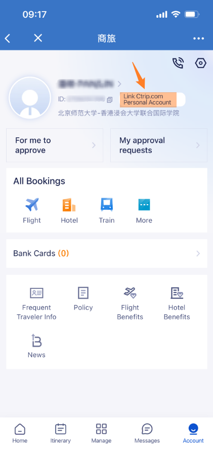 Staff members may link their personal Ctrip accounts to the BNBU Business Travel Platform. Subsequently, experience points accumulated through the business travel platform can be used to upgrade their personal membership tiers. The corresponding benefits of personal membership tiers, including discounts, Capital Airport boarding services, airport lounges, and expedited security checks, are accessible through the business travel platform. For detailed benefits, please refer to the personal Ctrip membership center