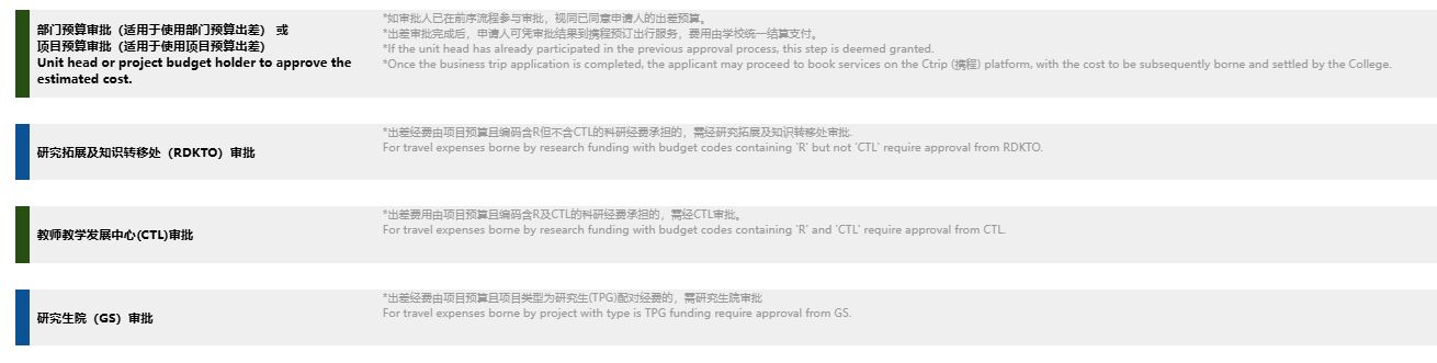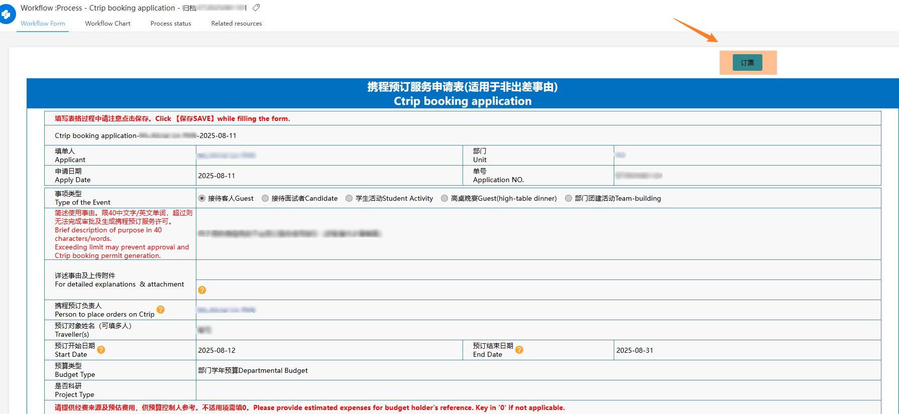 The estimated costs specified on the application form are validated against the available budget of the relevant department or project upon submission, but the budget is not frozen. After the monthly settlement between the university and Ctrip, the corresponding department or project budget will be deducted based on the actual order costs.