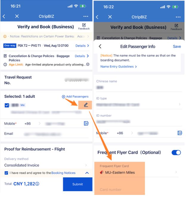 1)预订前在【个人信息】输入航司会员,提交订单时,勾选【常旅客卡】系统会自动识别该航司的会员号。