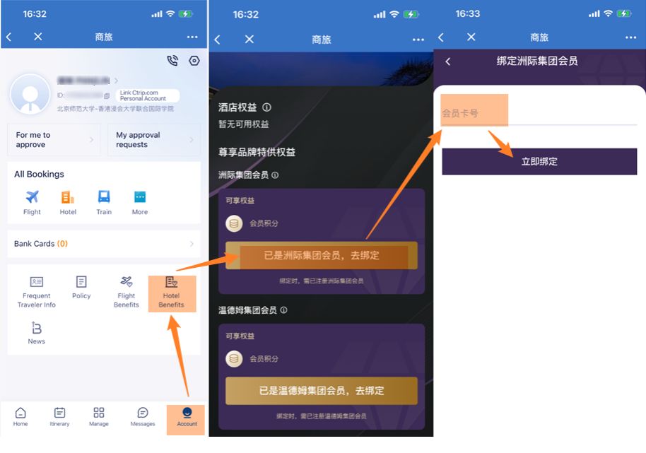 1)预订前在携程商旅【我的】点击【酒店权益】输入酒店会员,提交订单时,系统会自动识别已维护的酒店会员卡号。注意仅有部分酒店可在【酒店权益】进行绑定,未在【酒店权益】显示的酒店需在实际预订时手动填写酒店会员卡号。