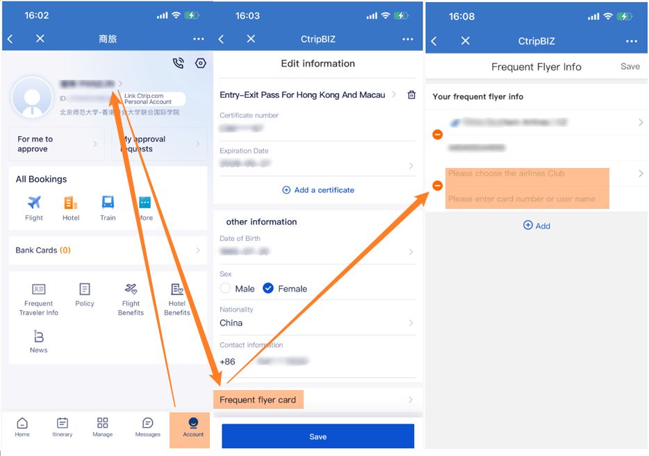Enter the airline membership in [Personal Information] section in advance. When placing the order, the system will automatically connect the membership by selecting the [Frequent Flyer Card].