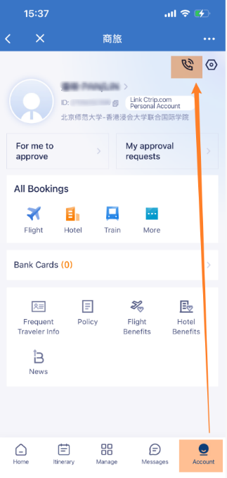 2)携程商旅企业微信端:点击携程商旅【我的】页面上方的客服图标。