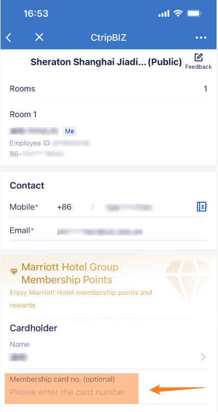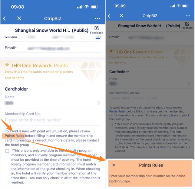2)若未在【酒店权益】输入酒店会员,也可在预订酒店的订单页手动输入酒店会员卡号进行积分。