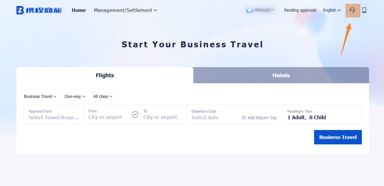 Website: Click the customer service icon in the upper right corner of the Ctrip Business Travel homepage.
