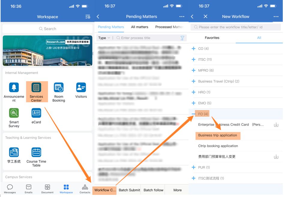 Go to Wecom Workspace → Workflow Center → FO → Business Trip Application/Ctrip Booking Application