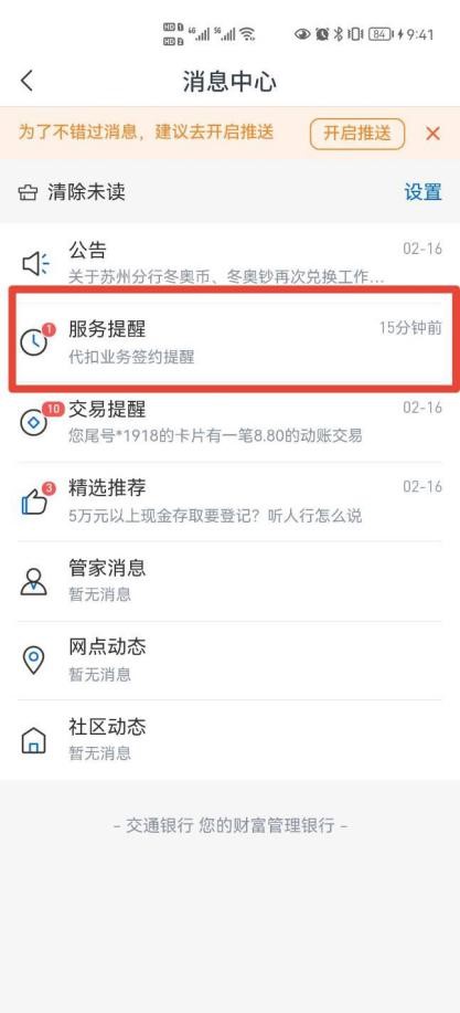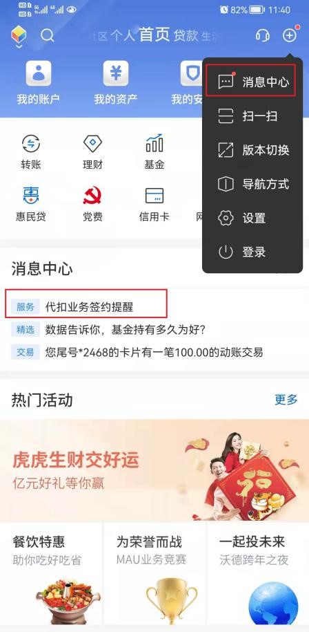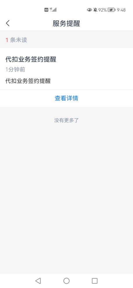 1.客户打开手机银行-消息中心-服务提醒可以看到代扣签约提醒,点击查看详情,进入代扣业务签约画面。
